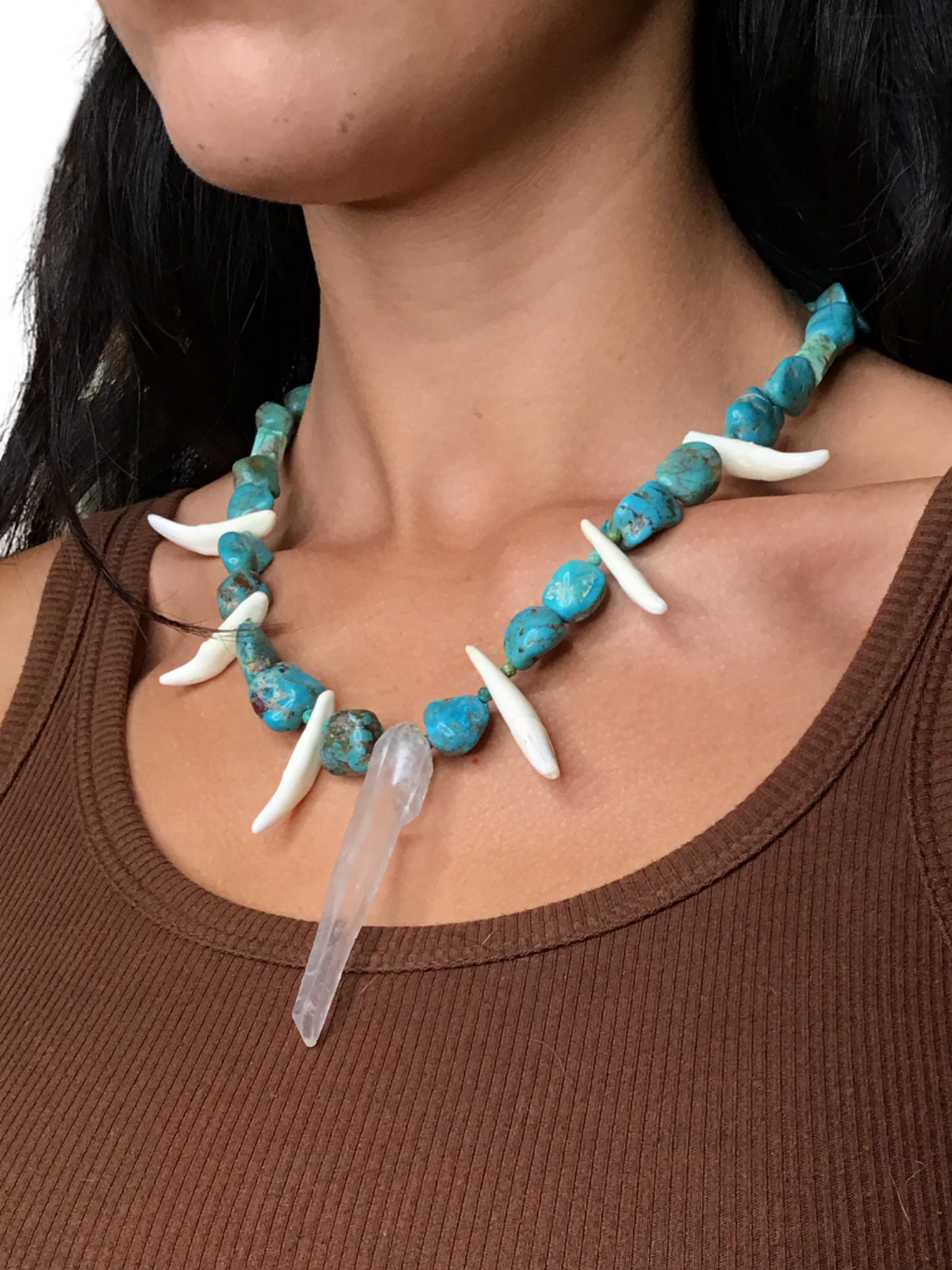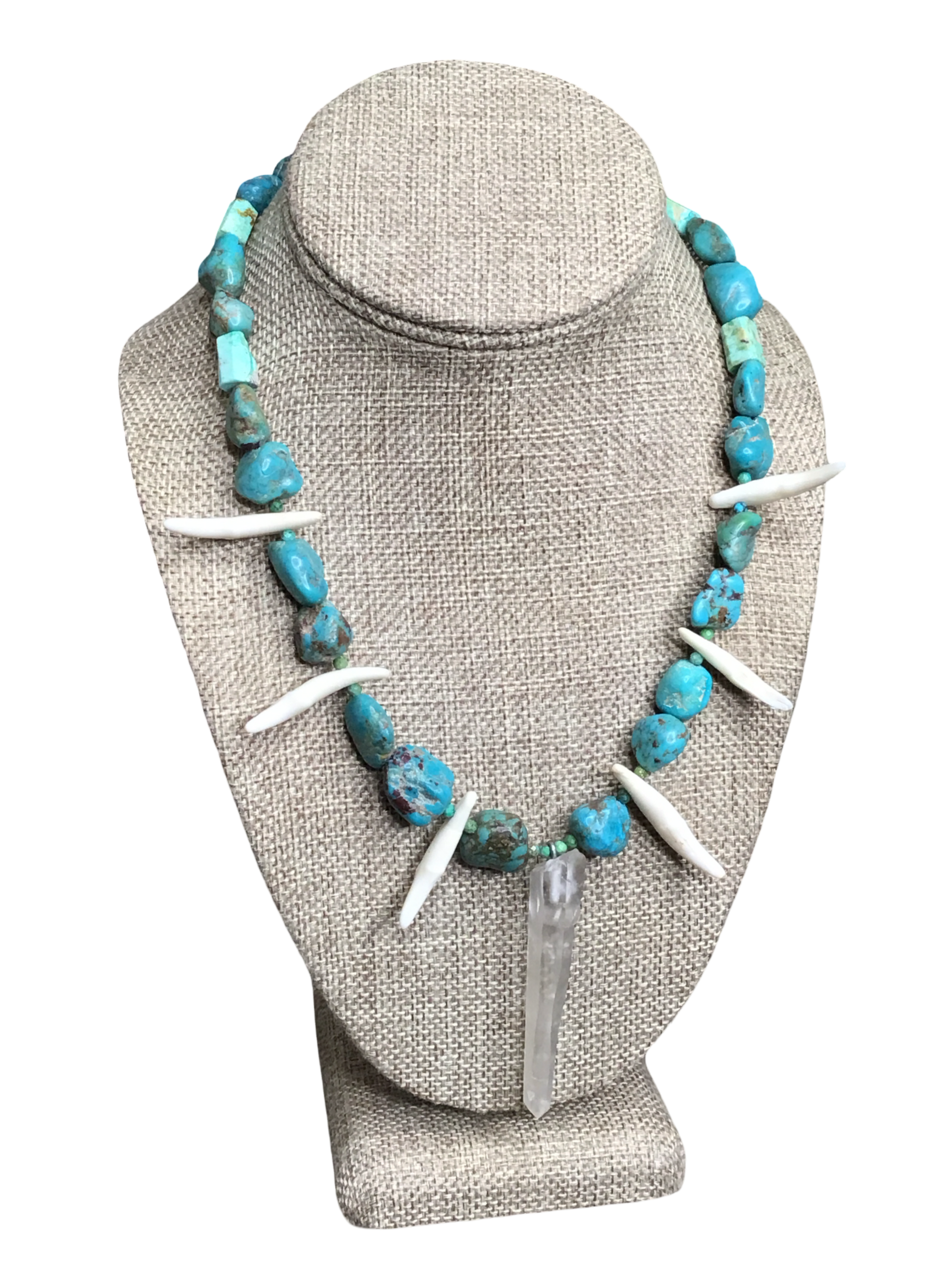 This turquoise necklace is made of sterling silver and features a unique blend of turquoise, quartz, and authentic coyote teeth, crafted with care by a talented local self-taught artist. Each piece carries a rustic charm and natural beauty, perfect for those seeking a meaningful accessory. Wear it to celebrate artistry and tradition with a distinctive, handcrafted touch.