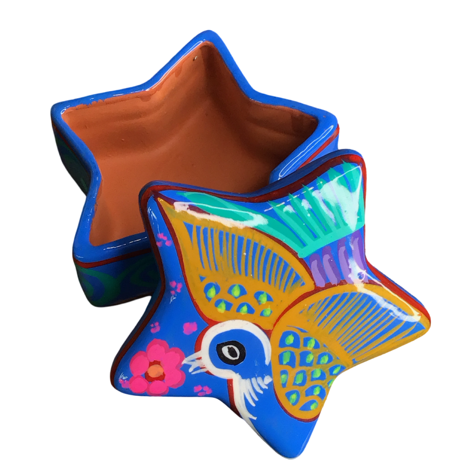 Crafted from clay and hand painted in Mexico, this jewelry and keepsake box stands out with its unique shape and vibrant designs. Measuring around 4 inches, it combines artisanal craftsmanship with functional elegance, making it an ideal choice for storing cherished items or adding a refined accent to any space.
