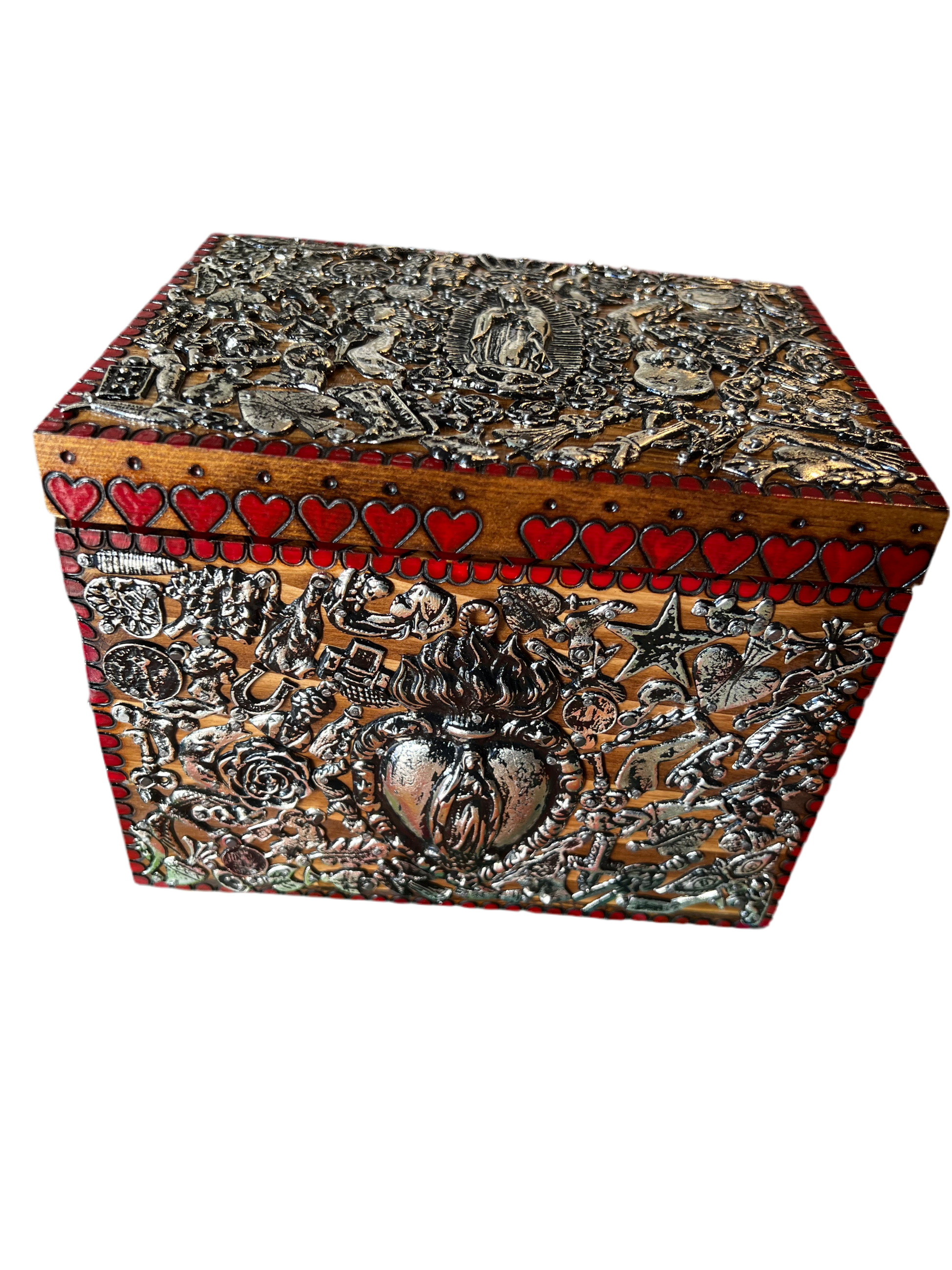 These handmade wooden boxes feature intricate pyrographic designs carefully burned into the wood and adorned with traditional Milagros, creating unique and meaningful pieces. Crafted by artisan, Jose Armas, offering a beautiful blend of artistry and spiritual symbolism. Perfect for adding a heartfelt touch to your home or as a thoughtful gift, this cross reflects dedication and craftsmanship in every detail. 6 x 7 1/2 inches