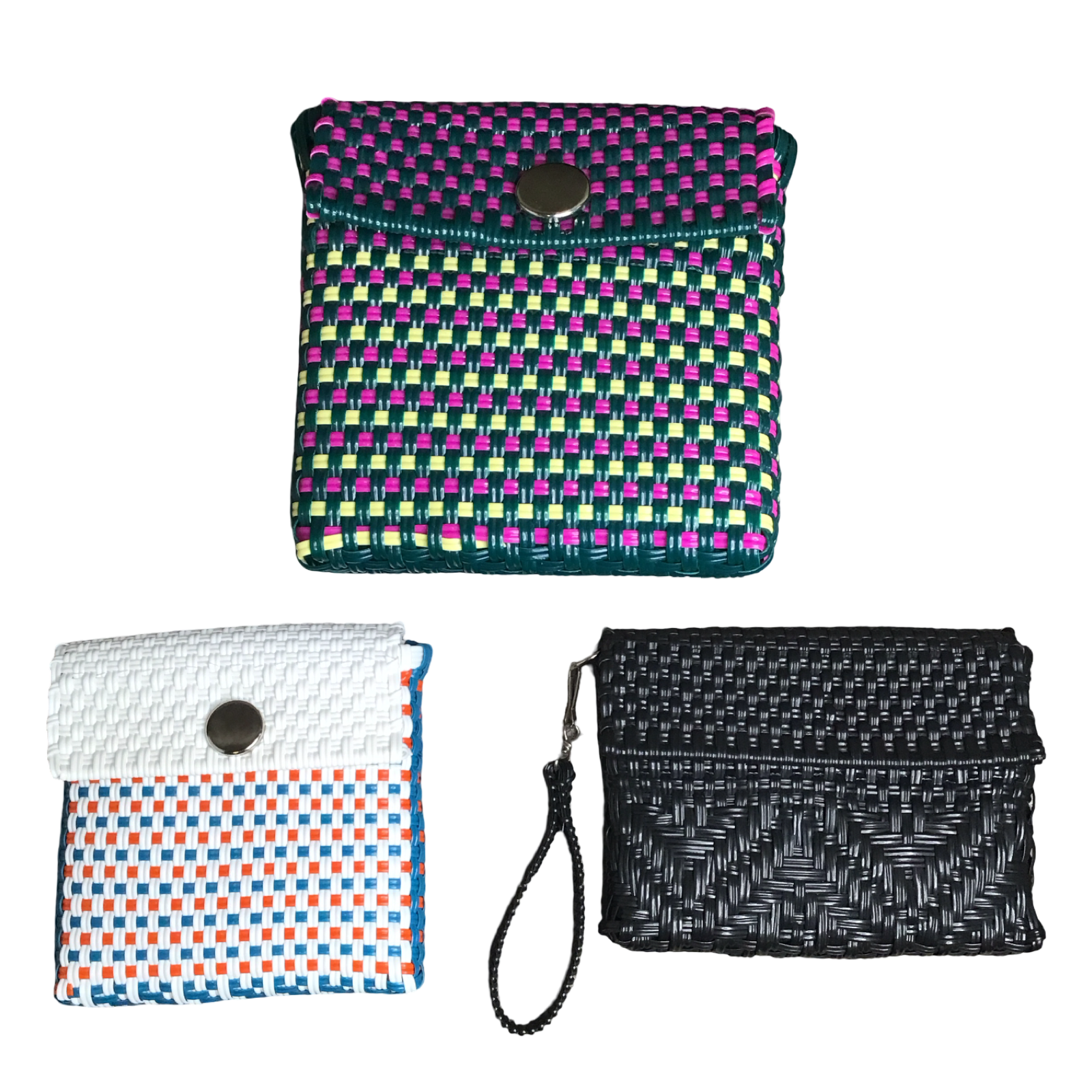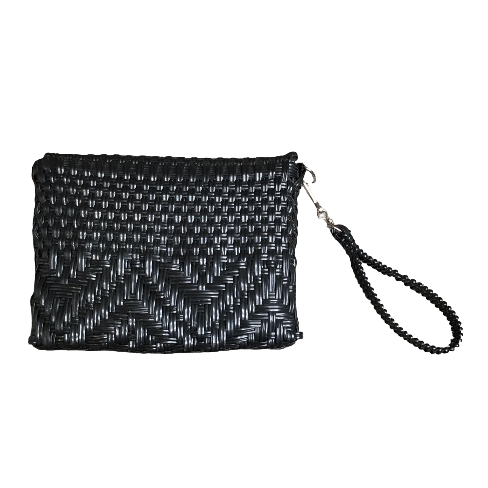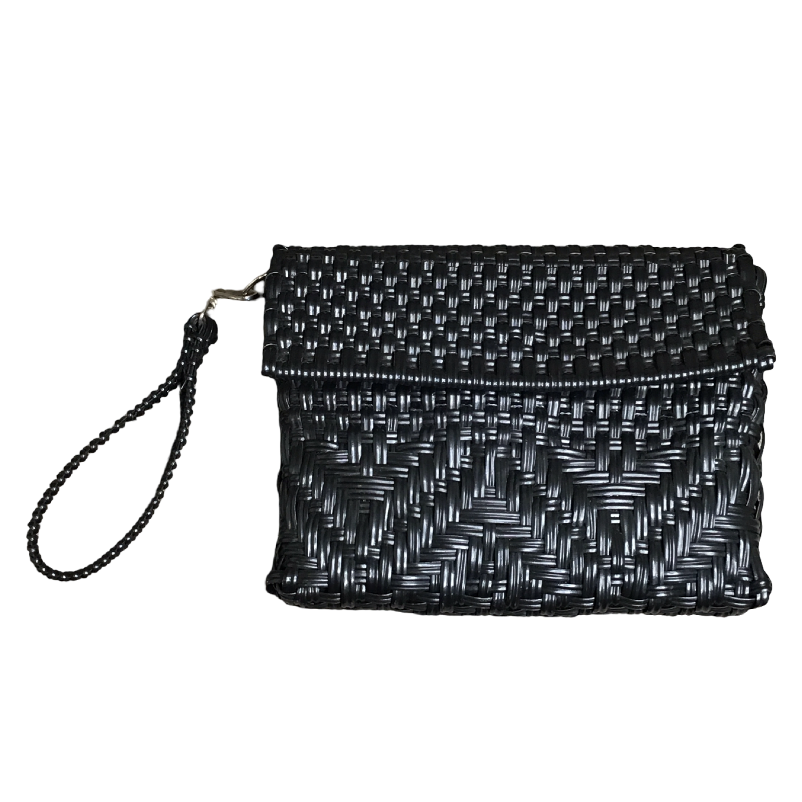 This Mercado Clutch, made from recycled plastic materials, is an eco-friendly accessory perfect for a night out. The black version features a removable wrist strap for added convenience, while the green and white clutches offer a sleek, strap-free design. Stylish and sustainable, this clutch combines functionality with a commitment to the environment.