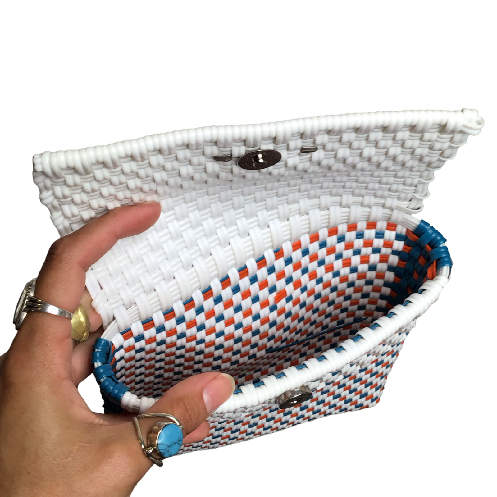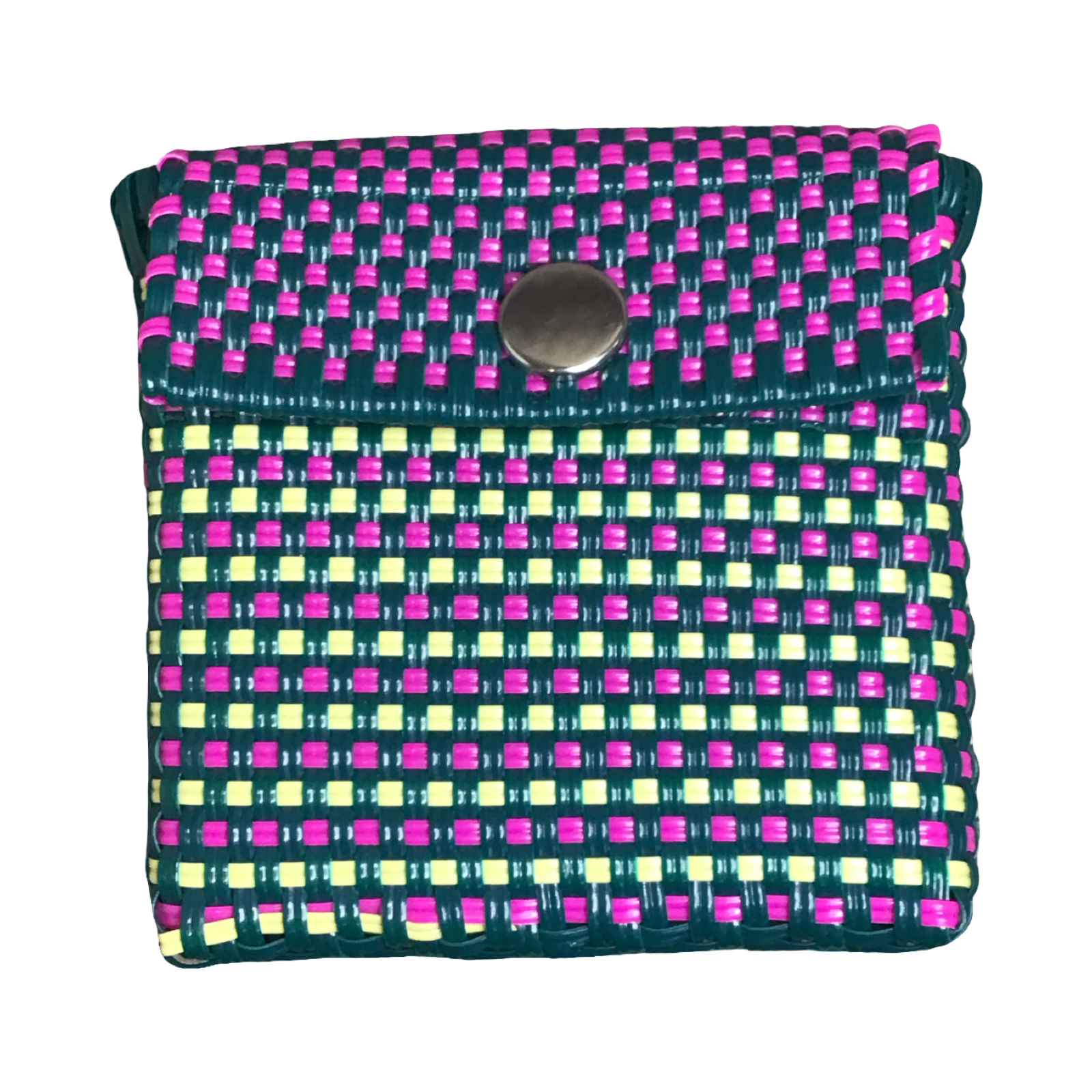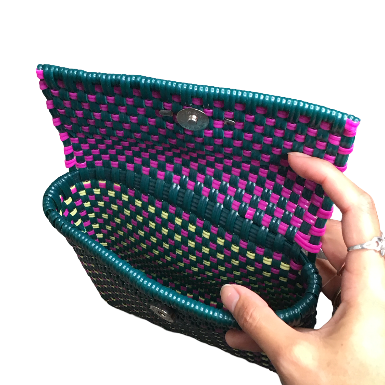 This Mercado Clutch, made from recycled plastic materials, is an eco-friendly accessory perfect for a night out. The black version features a removable wrist strap for added convenience, while the green and white clutches offer a sleek, strap-free design. Stylish and sustainable, this clutch combines functionality with a commitment to the environment.