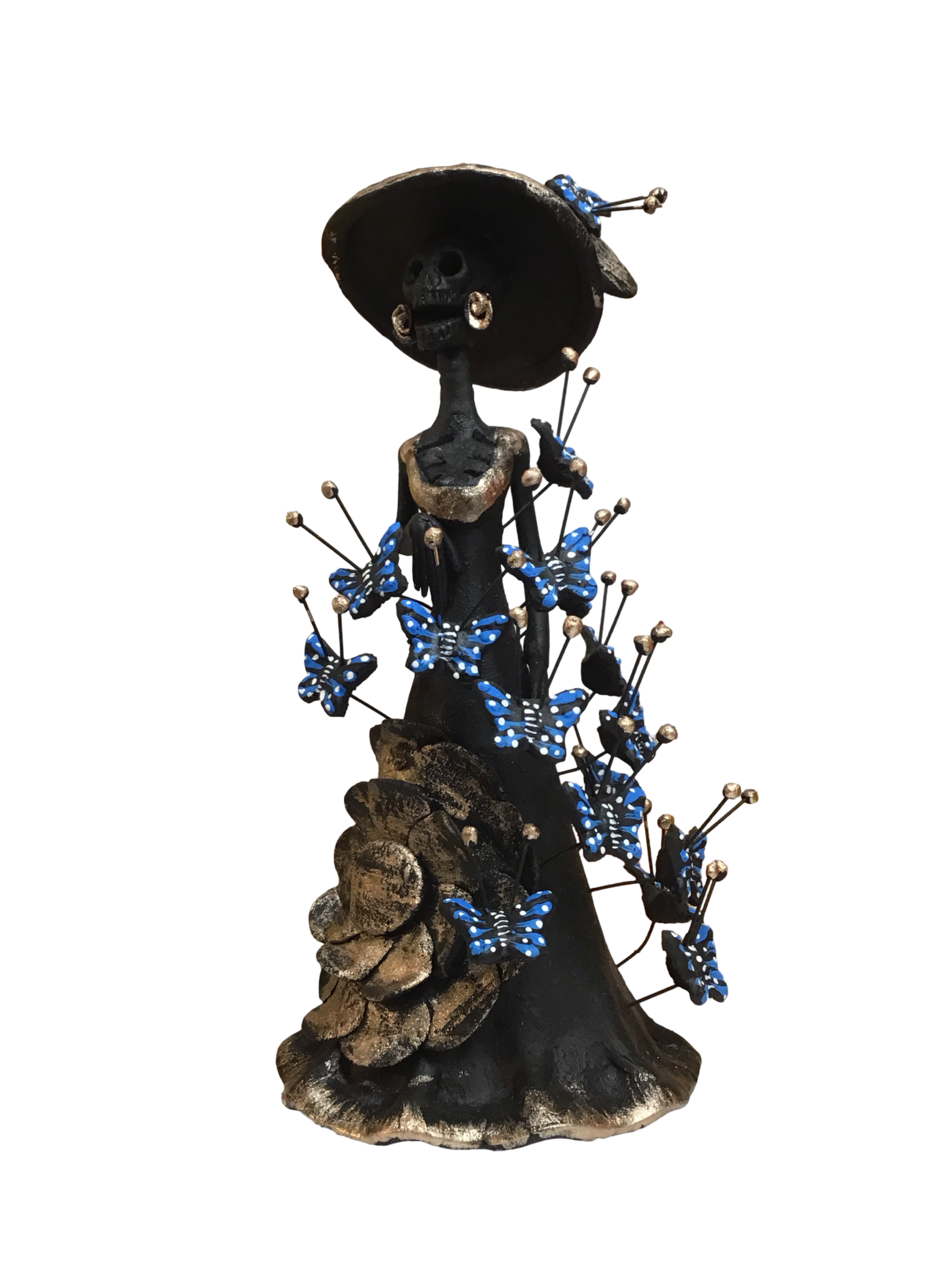 These exquisite Mini Catrinas are meticulously handcrafted and hand-painted in Mexico, embodying traditional artistry. Each set includes three unique figurines: one adorned with vibrant orange monarch butterflies, another featuring delicate blue butterflies, and a third decorated with intricate skull motifs. Perfectly sized for display, they capture the cultural essence with refined detail, making them a timeless addition to any collection.
