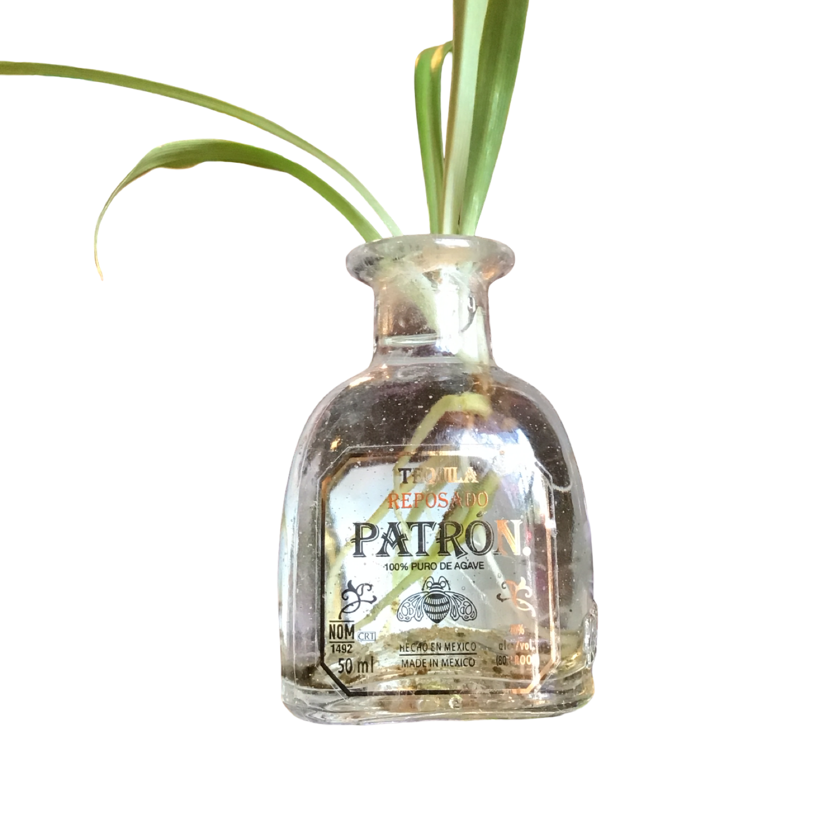 The Patron Plant features a spider plant growing gracefully in a miniature glass Patron bottle, ideal for thriving in water. This unique bottle is also perfect for propagating other plants, making it a versatile and attractive addition to your home or workspace. Easy to care for and supportive of your green-thumb journey.